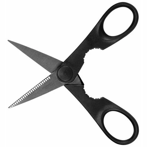 Küchenschere mit ZusatzfunktionEigenschaften:-Länge: 20 cm-Gewicht: 112 g-Kurze, spitz zulaufende Klinge-Gezahnte untere Klinge-Rutschfeste Griff